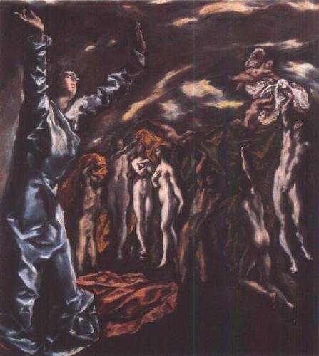 16世纪的艺术家对这些方法大加采用的,没有一个人能超过来自希腊克里特岛的一位画家多梅尼科·狄奥托科普洛斯(Domenikos Theotokopoulos, 1541?-1614),简短些就叫埃尔·格列柯(El Greco,即希腊人之意)。他是从一个孤立的地区来到威尼斯的,克里特从中世纪以来还没有出现任何新型艺术。在故乡时,他必定看惯了古代拜占庭手法的圣徒像;它们庄严、生硬,跟自然形象的外观相去甚远。他没有受过观赏画面正确设计的专门训练,所以没有发现丁托列托的艺术有什么可惊讶之处,反而觉得它有许多迷人的地方,因为他也似乎是热情而真诚的人,也渴望使用激动人心的新手法去叙述神圣故事。在威尼斯停留了一段时间之后,他定居在西班牙的托莱多(Toledo),这是欧洲的一个边远的地方;他住在那里也不容易遭到要求设计正确、自然的批评家的打扰和攻击,因为当时在西班牙,中世纪的艺术观念仍然迁延未消。这就可以解释为什么埃尔·格列柯的艺术在大胆蔑视自然的形状和色彩方面,在表现激动人心和戏剧性的场面方面,甚至超过了丁托列托。图238是他的最令人震惊而激动的画作之一。这幅画描绘圣约翰的《启示录》中的一段经文,我们看到的正是圣约翰本人,他站在画画的一边,沉迷在幻觉之中,眼望天国,以发表预言的姿势举起双臂。