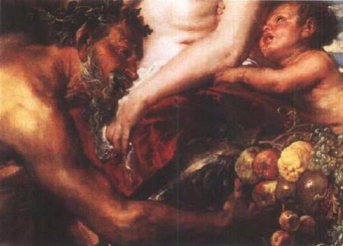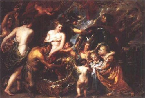 他在安排色彩缤纷的大型画面和在赋予画面以充沛的活力方面都有无与伦比的天赋,这些天赋相互结合使鲁本斯获得了以前的画家望尘莫及的声誉和成功。他的艺术是那么出色地适合为宫殿增添豪华和壮丽,为人间的权势人物增光生色,所以在他的领域内仿佛据有垄断者的地位。当时欧洲的宗教和社会的紧张局势达到危急关头,欧洲大陆处在可怕的三十年战争中,英国处在内战中。一边是专制君主和他们的宫廷,大都得到天主教的支持;另一边是新兴的商业城市,大都是新教徒。尼德兰自身就分裂为抗拒西班牙“天主教”控制的新教的荷兰和由忠于西班牙的安特卫普市统治的天主教的佛兰德斯。鲁本斯作为天主教阵营的画家登上了他的独一无二的高位。他接受的业务来自安特卫普的耶稣会会士和佛兰德斯的天主教统治者,来自法国国王路易十三和他狡诈的母亲玛丽亚·德·梅迪奇(Maria de' Medici),来自西班牙国王菲力普三世和英国国王查理一世,他们授予他爵士称号。当他作为贵宾从一个宫廷去到另一个宫廷时,他经常带有微妙的政治和外交使命,其中最重要的,就是为了我们今天称为“保守”同盟的利益,在英国和西班牙之间进行调停。同时他仍然跟当时的学者们保持接触,进行拉丁文的学术通讯,讨论关于考古和艺术的问题。他带着贵族佩剑的自画像(图258)表明他完全意识到他的独一无二的地位。可是在他的敏锐的目光中,却丝毫没有自大虚浮的地方;他仍然是个真正的艺术家。那些技艺眩人眼目的画作,一直在从他的安特卫普的画室中大量倾泻出来。他创作的古典寓言画和寓意画,跟他自己女儿的那幅画像一样栩栩如生,令人叹服。寓意画通常被人认为相当枯燥而抽象,但在鲁本斯那个时代却成为表达思想观念的便利手段。图259就是这样一幅画,据说鲁本斯是把它作为礼物带给查理一世的,当时他正试图劝说他跟西班牙媾和。这幅画对比了和平的赐福和战争的恐怖。密涅瓦(Minerva)这位司智慧和才艺的女神在驱逐战神玛尔斯(Mars),玛尔斯正要退却——他的可怕的同伴复仇女神(Fury)已经转身而去。在密涅瓦的保护之下,和平的快乐在我们跟前展现开来,这些象征丰饶富足的标志只有鲁本斯能够想像出来,和平之神(Peace)正要给一个孩子喂奶,一个农牧神快乐地注视着那些美好的水果(图260),还有巴克科斯(Bacchus)的其他同伴,即带着金银财宝跳舞的两个女祭司(maenad),和那只像大猫一样正在平静地玩耍的豹;另一边有三个孩子不安地瞪着眼睛从战争的恐怖之下逃到和平与富足的庇护之地,一位幼小的守护神给他们带上花冠。凡是一心沉浸在这幅画的丰富细部、生动对比和鲜艳色彩之中的人,都能看出这些观念对于鲁本斯来讲已不是软弱无力的抽象事物,而是生动的现实事物。大概就是因为这个特点,有些人必须首先对他的作品习惯起来,才能开始热爱和理解他的作品。他不喜欢古典美的“理想”形式;对他来说,它们太生疏、太抽象。他所画的男男女女是他眼见心爱的那一类活生生的人。这样,由于他那时代在佛兰德斯并不流行苗条身材,于是今天就有一些人不喜欢他画中的“肥胖女人”。这种批评自然跟艺术没有多大关系,所以我们就不必认真对待。不过,由于经常有人提出这种批评,所以有必要认识到鲁本斯对于活泼而近乎喧闹的生活的形形色色的表现都深有所喜,使他不致成为纯粹卖弄精湛技术的艺匠。这就使他的绘画从娱乐处所的巴洛克装饰品一变而为艺术杰作,甚至在博物馆里的冷飕飕的气氛中仍然保持着它们的生命力。