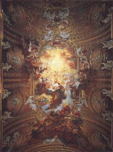 如果像贝尔尼尼的“圣特雷莎”那样的雕刻作品的确只能在它们原定的环境之中进行评价,那么对于巴洛克式教堂中的绘画装饰品来说,情况就更是如此。图287是罗马的耶稣会教堂的天花板装饰,出于追随贝尔尼尼的画家乔瓦尼·巴蒂斯塔·高里(Giovanni Battista Gaulli, 1639-1709)之手。这位艺术家想给我们一种教堂的拱顶已经打开的感觉,一种让我们直接看到天堂荣耀的幻觉。以前科雷乔有把天空画在天花板上的念头(见338页,图217)。但是高里的效果不可比拟地更为舞台化。主题是“耶稣圣名的崇拜”(the Holy Name of Jesus),圣名用放光的字母刻在教堂的中央,四周围着无数有翼小童(cherub)、天使和圣徒,个个狂喜地凝视着那光线,而一群群恶魔或者堕落的天使被整批赶出天界,表现出了绝望的样子。拥挤的场面似乎要冲破天花板的边框,天花板上到处都是云彩,载着圣徒和罪人直奔教堂而来。艺术家想使我们在画面冲破边框的情况下茫茫然而不知所措,结果我们就再也分辨不出哪儿是现实,哪儿是错觉了。像这样一幅画离开它原定的所在以后就毫无意义。所以,在巴洛克风格充分发展起来以后,所有艺术家都通力合作,去达到某种效果,而作为独立艺术的绘画和雕刻在意大利和欧洲整个天主教地区就衰微了,大概这完全不是偶然的巧合。
