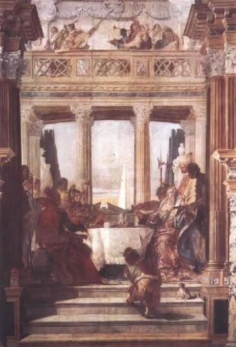 在18世纪,意大利的艺术家主要是一些卓越的内部装饰家,他们的灰泥装饰技术和伟大的湿壁画驰名全欧,能把一座城堡或一座修道院的任何大厅粉饰为盛典嘉会的场所。其中最著名的有—位是威尼斯的乔瓦尼·巴蒂斯塔·提埃坡罗(Giovanni Battista Tiepolo, 1696-1770),他不仅在意大利工作,还在德国和西班牙工作。图288是他给一座威尼斯宫殿所做的装饰的一部分,大约画于1750年,它表现的题材是款待克娄巴特拉(Cleopatra)的宴会,这个题材给丁提埃坡罗各种机会去显示鲜艳的色彩和豪华的服装。传说马克·安东尼(Mark Antony)设宴招待埃及女王,宴会一定要ne plus ultra(无比)豪华。最名贵的菜一道道接连而上,无止无休。女王却无动于衷。她跟骄傲的主人打赌,说她要做一道菜,比他已经摆上来的菜要珍贵得多;她从耳环上摘下一颗著名的珍珠,溶解在醋中,然后喝掉这饮料。在提埃坡罗的湿壁画上,我们看到她给马克·安东尼看珍珠,而一位黑仆则拿给她一个玻璃杯。
