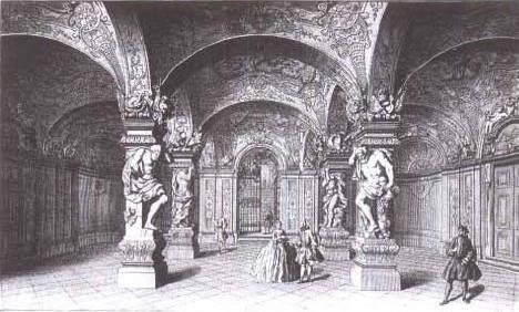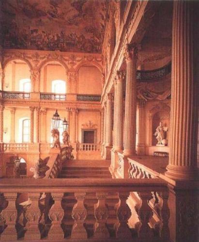 只有进入建筑物以后,我们才能感觉到那奇异的装饰风格的全部效果。图294是欧根王侯的宫殿的门厅,图295是希尔德布兰特设计的一座德国城堡的楼梯部分。我们不可能恰当地评价这些内部设计,除非我们能够想像出它们在使用时的景象——某一天主人正在举行宴会,或举行招待会,那时灯火通明,打扮得又华丽又高贵的时髦男女莅临以后走上了那些楼梯。在那样一个时刻,当时的街道黑暗无灯,肮脏污秽,气味熏人,而在这贵族之家却是光芒四射的神话世界,二者的鲜明对比必定是极为强烈的。