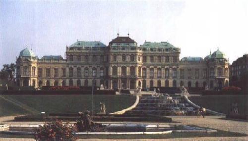 只是到了下一代,建筑家们才完全吸收了这个经验教训,因为巴洛克风格的罗马教堂和法国城堡已激发了当时的想像力。在德国南部,每一个小君主都想拥有一所他自己的凡尔赛宫;在奥地利和西班牙,每一座小修道院都想跟博罗米尼和贝尔尼尼的感人至深的壮丽设计争奇斗胜。1700年前后那一段时期是最伟大的建筑时代之一;而且还不单单是建筑的伟大时代。当时的城堡和教堂不是简单地设计成建筑物而已,而是要求所有艺术部门都做出贡献,以便建成一个异想天开的人造世界。整座整座的城镇仿佛都被用做舞台布景,大片大片的田园被改造成花园,溪流则改造成小瀑布。艺术家得到充分自由去尽情地设计,把他们的最出人意表的想像用石头和金色的灰泥去化为现实。往往在他们的计划还未成为现实时,金钱就已经花光了;但是爆发了那一阵奢侈的创造热潮以后,结果促进了欧洲天主教地区许多城镇和风景的面貌的改观。特别是在奥地利、波希米亚和德国南部,意大利和法国的巴洛克风格的观念融合成为最大胆、最一致的风格。图293是奥地利建筑家卢卡斯·冯·希尔德布兰特(Lucas von Hildebrandt, 1668-1745)在维也纳为马尔波罗(Marlborough)的盟友萨瓦(Savoy)王侯欧根(Eugene)建造的城堡。这座城堡矗立在一座山上,好像轻盈地翱翔于一个有喷泉和矮树篱的梯形花园之上。希尔德布兰特把它明确地组合成7个不同的部分,使人联想到花园中的亭台;有5个窗户的中央部分向前突出,两边辅以2个略矮的翼部,而这个组合又在两侧辅以较矮的部分和4个构成整个建筑边框的塔楼式的角亭。中央的楼台和两边的角亭是装饰最富丽的部分,建筑物形成一个复杂的图形,然而轮廓仍然十分清楚、明晰。就连希尔德布兰特用来装饰细部的奇特的怪诞装饰,那向下渐细的半柱、窗户上断续的旋涡式弧形檐饰和沿屋顶排列的雕像与战利品装饰,也完全没有破坏建筑物的清晰性。