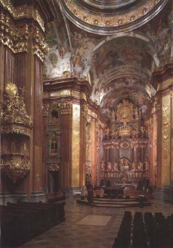 教会的建筑物也使用了类似的惊人效果。图296是奥地利多瑙河畔梅尔克的修道院(monastery of Melk)。当人们顺流而下的时候,修道院,还有它的穹窿顶和奇形怪状的塔楼,矗立在山上,好像是奇异的幻影。这座建筑是一位叫做雅各布·普兰德陶尔(Jakob Prandtauer, ?-1726)的本地建筑师修建的,其装饰则出于一些意大利的旅行virtuos(艺匠)之手;那些旅行艺匠备有从巴洛克图形的丰富宝藏中得来的新颖的想法和设计。那些卑微的艺术家能把一座建筑物分组地组织在一起,形成高贵而不单调的外观,他们所掌握的艰深的技术是多么精湛!他们也细心地把装饰分成等级,在他们想加以突出的那些建筑部分中节俭地、然而却更加有效地使用那些最为奢侈的装饰形式。