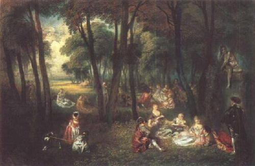 人们可以理解,阿尔卑斯山以北地区的情况也绝对不逊于意大利,每一种艺术形式都被卷入这一放纵的装饰活动之中,大大地丧失了它们独自的重要性。当然在1700年前后那一段时期也不是没有知名的画家和雕刻家,然而大概只有一位名家的艺术可以跟17世纪前半期的伟大的绘画名家相比。那位名家是安托万·华托(Anloine Watteau, 1684-1721)。华托生在比利时,但是定居在巴黎,37岁那年在巴黎故去。他也为贵族的城堡设计内部装饰品,为上流社会的节庆和盛会设置合适的环境。但是实际生活中的喜庆活动仿佛没有使这位艺术家的想像力得到满足。他开始画自己想像中的摆脱了苦难和琐事的生活景象,那是一种梦境般的美好生活,在从来也不下雨的神话花园里快乐地野餐,那是淑女个个美丽、情郎个个优雅的音乐集会,在那样一个社会里,人人都穿着光彩闪烁的绫罗绸缎,然而却不显得浮华,男女牧民的生活好像是一连串的小步舞。从这样的描述中,人们可能得到一个印象,以为华托的艺术过分精美而不自然。许多人认为华托的艺术已经开始反映18世纪初期法国贵族的趣味即罗可可(Rococo)风格:那是一种喜欢优美的色彩和精巧的装饰的时尚,它代替了巴洛克时期较为刚健的趣味,表现出一种快乐的轻浮。但是华托是个远为伟大的艺术家,不可能就是他那个时代时尚的代表而已。可以说他以他的美梦和理想助长了我们所谓的罗可可时尚的形成。正如凡·代克曾经帮助产生了联想到王党成员的那种绅士派头的潇洒观念(见405页,图262),华托也用他的优美风流的景象丰富了我们的想像宝库。